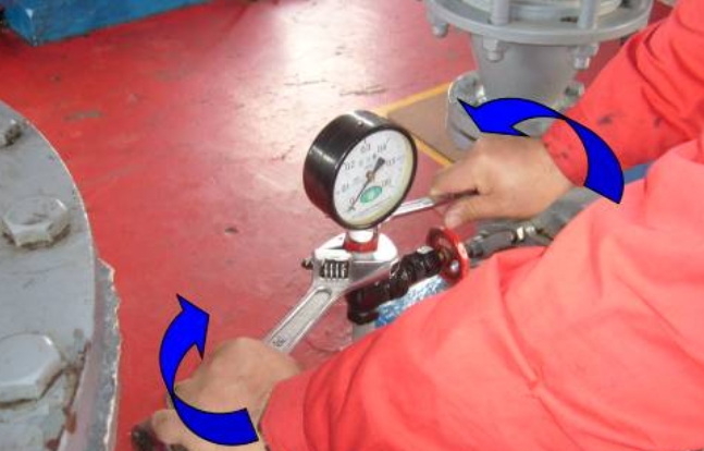 用活动扳手和固定扳手按正确的方向拆卸旧压力表,当卸至压力表与接头特别松动时,用手边拧压力表边晃动,泄掉表内余压。