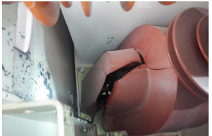但多数挡板的材质,在环境潮湿的情况下又非常容易吸收水分,并积污,造成绝缘的进一步降低,更易引发相间短路。下图是发生相间短路的PT情况。