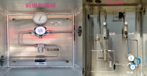 1、打开前级处理箱和预处理箱,检查压力调节器、T型过滤器、根部阀、截止阀、卡套拨动开关阀等均处于正常状态,样气流量计也有流量,且在正常范围内(转子处于满量程的1/3~2/3处);