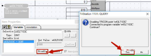 5、点击Disable,弹出的确认对话框选择Yes。此时,Set Value框由不可输入状态变成可输入状态。该点字体颜色由黑色变成红色。